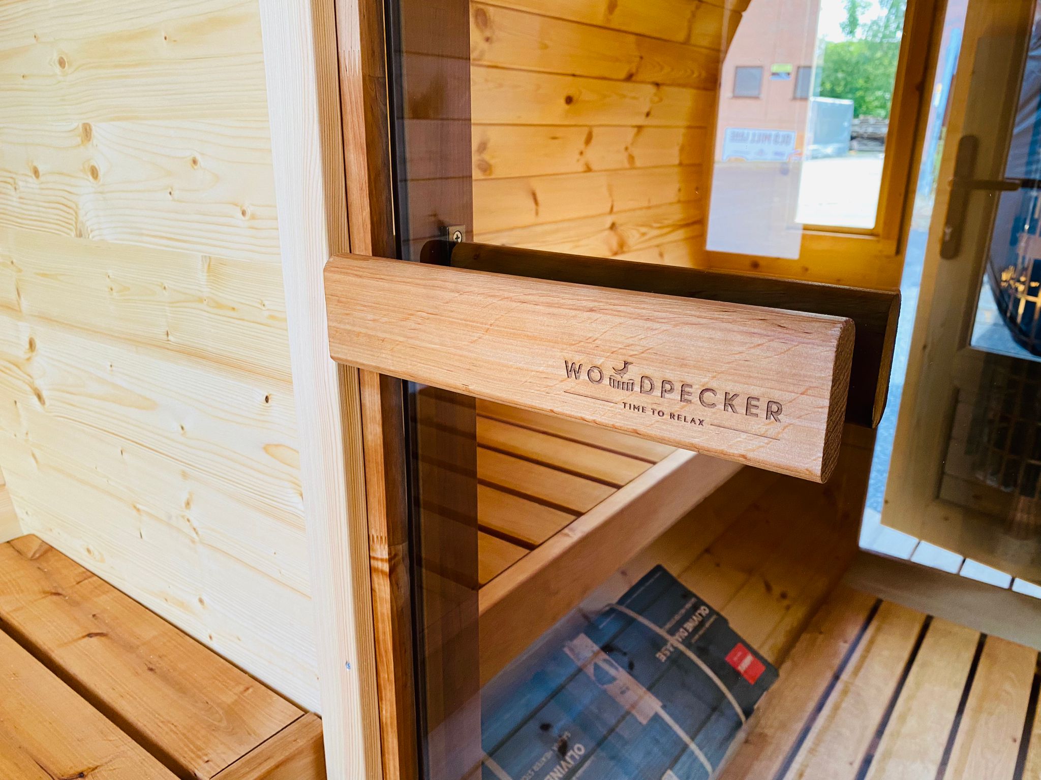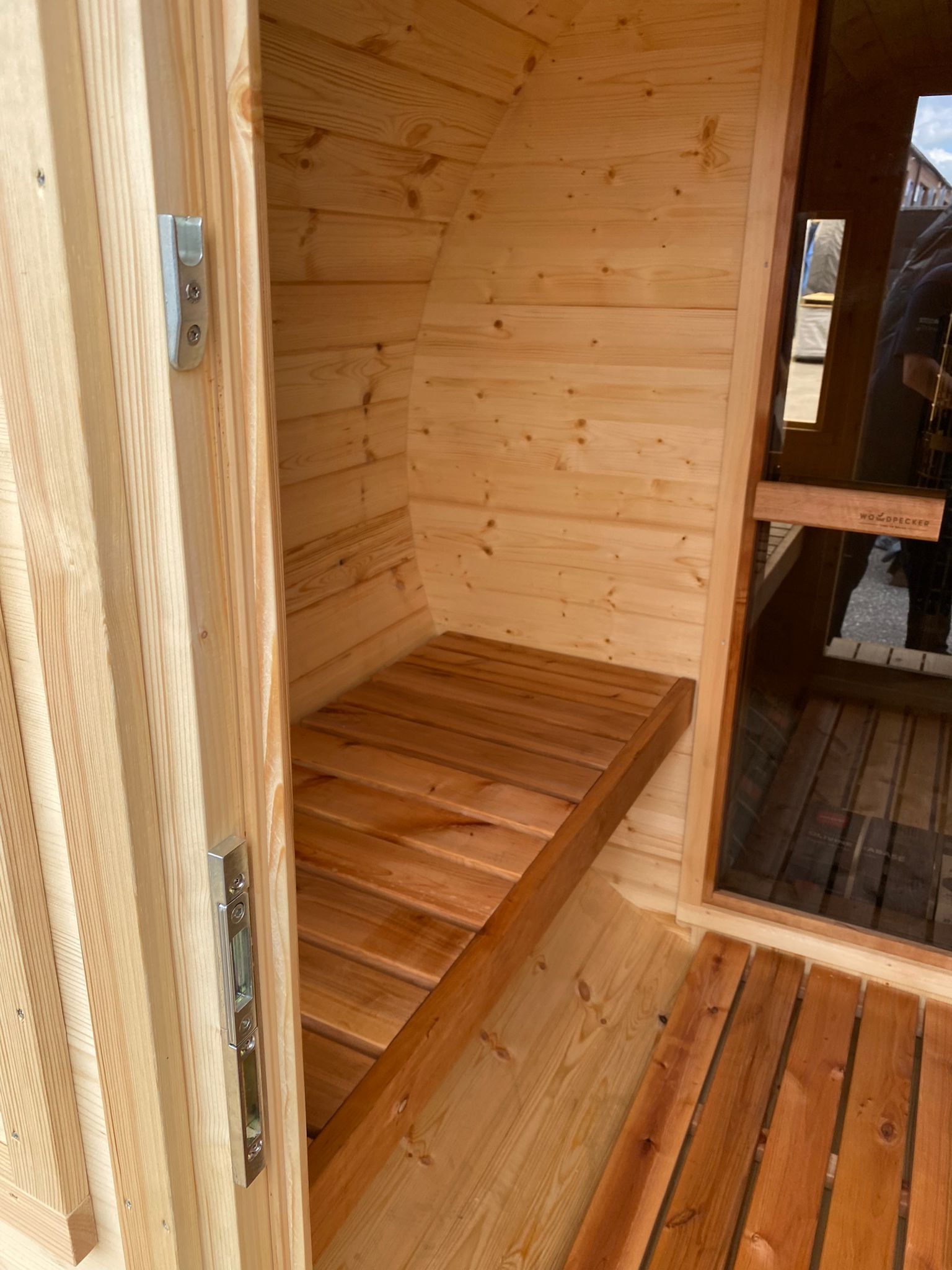 The largest sauna in the Woodpecker range, featuring terrace seating area. The interior contains luxurious alder benches, and comfortable room for 6 adults. Add an optional panoramic safety glass rear wall for a stunning view of your garden while bathing. Includes LED interior lighting and Harvia® heater.