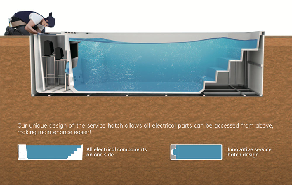 The unique design of the Easy Pool series makes servicing your swim spa easy. All service items and electrical components are easily accessible via a convenient, topside hatch.