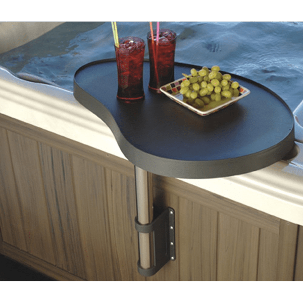 The table has a centre pivot design that allows you to swing it in or out of the spa. Can quickly mount to almost every spa. Made of reinforced, weather resistant resin polymer train on an aluminium post. Stainless steel attachments that are easily fitted to the cabinet. size of the tray is 23″ x”15″—27 inches at the longest part and 19 inches at the widest